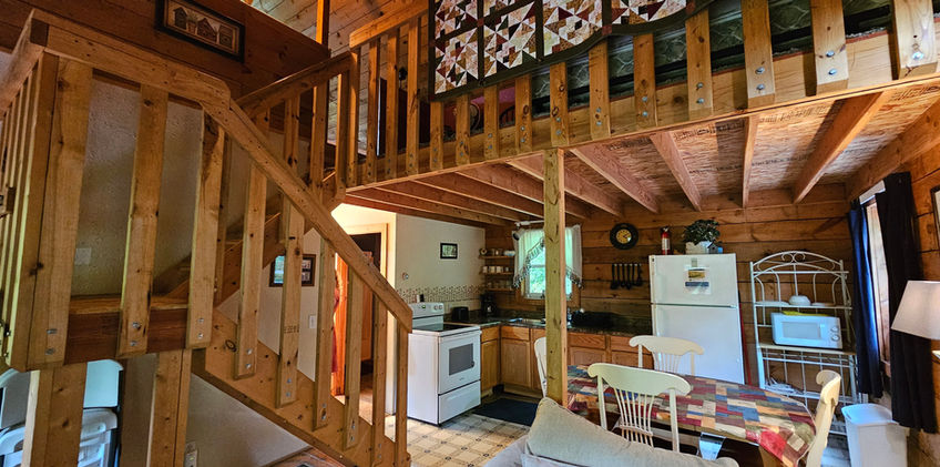 Hand crafted in 1999, the Bird's Nest (decorated in bird decor with outside feeders for bird lovers) is made from local white pine logs that we hand hewed with a drawknife, giving it a very unique look. This cutely decorated cabin has 1 bedroom (Queen size bed), plus 2 loft areas accessed by steps (2 twin beds in one loft and a double bed in the other loft). The large bathroom has a shower/tub and toilet, with the bathroom sink located in the hallway for easy access when the bathroom is being used. The living room/great room area has a cathedral ceiling, a fireplace, sofa, and a television for playing DVD's (no reception). There is a kitchen with full size appliances with all of the dishes, utensils and cookware supplied. Outside the cabin is a porch that runs the full length of this 26 x 24 log cabin and a picnic table, charcoal grill and fire ring. This cabin is great for outdoor fires, sitting on the porch and watching the birds, and just downright relaxing! Come and enjoy watching the humming birds and the Red necked Grosbeaks! (We permit pets in this cabin, with prior arrangements).